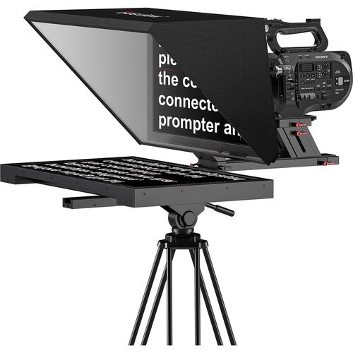 The monitor features HDMI and VGA inputs, and the top of the hood features two shoe mounts to add accessories such as a light or microphone. The included Bluetooth remote control and foot pedal offer different forms of control of your text speed. There is also an app that installs on Windows to control the script. Included with the set are all the mounting tools you need to assemble your teleprompter as well as cables to get you started.