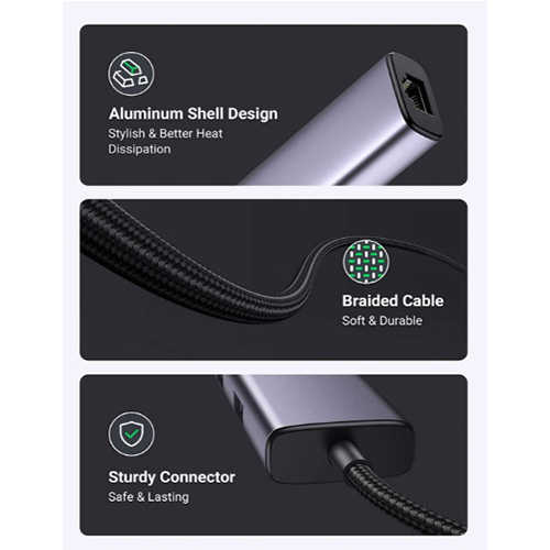 Elegant and Durable Design: This UGREEN USB 3.0 to RJ45 adapter adopts a new aluminum shell design, which is not only beautiful and elegant, but also anti-fingerprint, anti-corrosion and has better heat dissipation. And the durable braided cable design also greatly improves the service life of the product.